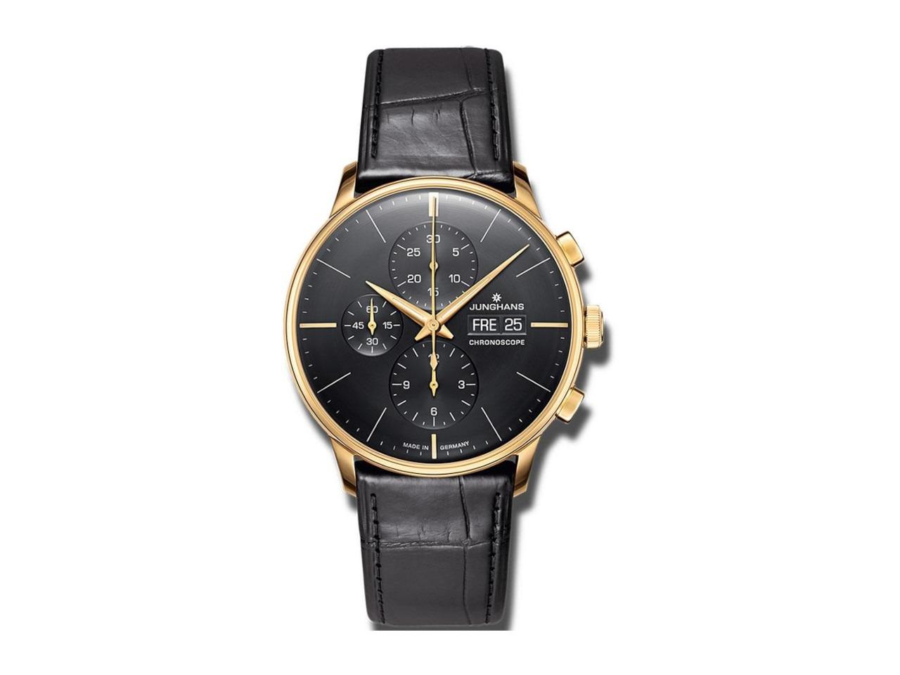 Junghans Meister Chronoscope Automatik Gelbgold 40mm schwarzes Zifferblatt schwarzes Lederband