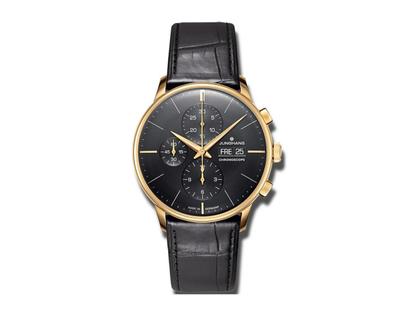 Meister Chronoscope, Automatik Chronograph mit einem Gehäuse aus 750/- Gelbgold im Durchmesser von 40,7 mm, Höhe 13,9 mm, anthrazitfarbenes Zifferblatt mit Datum, Wochentag und Stoppfunktion, schwarzes Lederband mit vergoldeter Dornschließe, Saphirglas, Glasboden, 3 bar wasserdicht