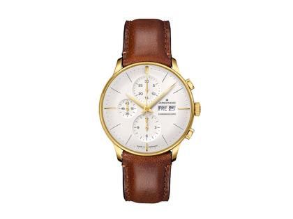 Junghans Meister Chronoscope Automatik Edelstahl Gelbgold-PVD 40mm weißes Zifferblatt braunes Lederband
