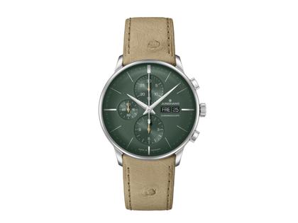 Automatikwerk Kaliber J880.1 mit einer Gangreserve bis zu 48 Stunden, Chronograph, Edelstahlgehäuse, Durchmesser von 41 mm, Höhe 13,9 mm, Tannengrünes Zifferblatt mit Datum und Wochentag, Stoppfunktion, braunes Straußenlederarmband mit Dornschließe, gewölbtes Saphirglas beidseitig entspiegelt, Glasboden, 5 bar wasserdicht