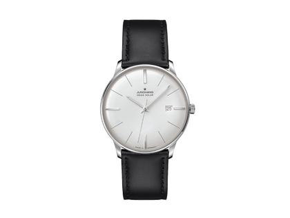 Junghans Meister Mega Solar Edelstahl 38mm weißes Zifferblatt schwarzes Lederband
