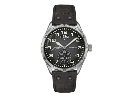 In den 1930er Jahren produzierte Junghans Borduhren für Flugzeuge und Luftschiffe, in den 1950ern einen legendären Flieger-Chronographen für die Bundeswehr. Lebenswichtig für Piloten, erfreulich für Uhrenliebhaber: die gute Ablesbarkeit der Pilot Automatic. Das Zifferblatt mit seinen markanten Leuchtzahlen und Zeigern bietet eine optimale Ablesbarkeit. Authentischen Bordinstrumenten nachempfunden, verstärken die großen Zahlen der Datumsanzeige den Cockpit-Charakter der Uhr. Die Kleine Sekunde mit rotem Zeiger sorgt für zusätzliche Übersichtlichkeit. Die ergonomisch konzipierte Lünette sorgt sowohl für eine gute Griffigkeit als auch für eine einmalige Optik. Das historische Logo auf dem Zifferblatt weist auf die traditionelle Verbundenheit von Junghans zur Luftfahrt hin.
