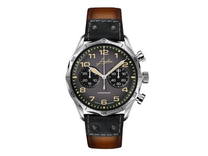 Junghans Meister Pilot Chronoscope Automatik Edelstahl 43mm graues Zifferblatt braunes Lederband