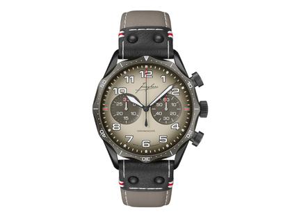 Automatikwerk Kaliber J880.4 mit einer Gangreserve von 38 Stunden, braun-schwarz DLC-beschichtetes Edelstahlgehäuse im Durchmesser von 43,3 mm, Höhe 14,4 mm, beidseitig drehbare Lünette, sandfarben effekt-lackiertes Zifferblatt mit Stoppfunktion, kleiner Sekunde und 30-Minutenzähler, sandfarbenes Lederband mit Vernietung und DLC-beschichteter Edelstahl-Dornschließe, gewölbtes und beidseitig entspiegeltes Saphirglas, 7-fach verschraubter Edelstahlboden mit Aviation-Gravur, 10 bar wasserdicht