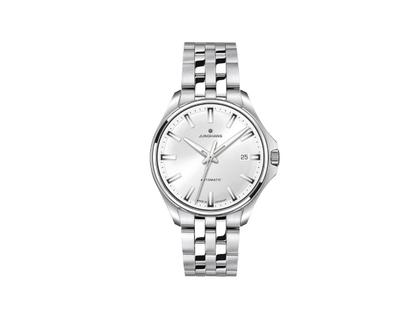 Automatikwerk J800.1 mit einer Gangreserve von 38 Stunden, poliertes Edelstahlgehäuse im Durchmesser von 36,0 mm, Höhe 11,3 mm, Edelstahl-Krone, weißes Zifferblatt, Datum auf 3 Uhr, silberfarbene Zeiger und Indizes mit weißer Leuchtmasse, schwarze Minuterie, poliertes mehrgliedriges Edelstahlarmband mit Faltschließe, Saphirglas entspiegelt, 7-fach verschraubter Edelstahl-Gehäuseboden mit Junghans Stern-Grafik, 10 bar wasserdicht