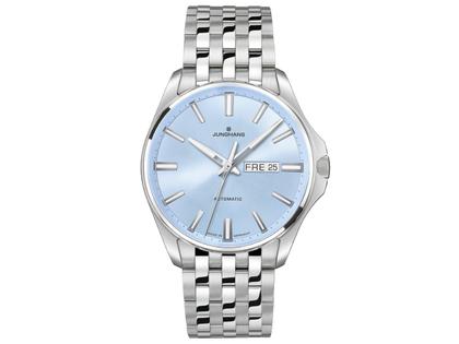 Automatikwerk J800.4 mit einer Gangreserve von 38 Stunden, poliertes Edelstahlgehäuse im Durchmesser von 44,0 mm, Höhe 13,0 mm, verschraubte Edelstahl-Krone, blaues Zifferblatt, Datums- und Wochentagsanzeige auf 3 Uhr, silberfarbene Zeiger und Indizes mit weißer Leuchtmasse, weiße Minuterie, poliertes mehrgliedriges Edelstahlarmband mit Faltschließe, Saphirglas entspiegelt, 7-fach verschraubter Edelstahl-Gehäuseboden mit Junghans Stern-Grafik, 20 bar wasserdicht