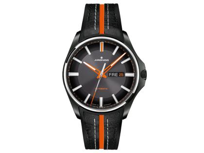 Automatikwerk J800.4 mit einer Gangreserve von 38 Stunden, Edelstahlgehäuse Schwarz-PVD beschichtet im Durchmesser von 44,0 mm, Höhe 13,0 mm, verschraubte Edelstahl-Krone Schwarz-PVD beschichtet, graues Zifferblatt, Datums- und Wochentagsanzeige auf 3 Uhr, orangefarbener Stunden- und Minutenzeiger mit weißer Leuchtmasse, silberfarbener Sekundenzeiger mit orangefarbener Spitze, silberfarbene Indizes mit weißer Leuchtmasse, orangefarbene Minuterie, schwarzes Kautschukband mit Ledereinlage und Edelstahl-Faltschließe Schwarz-PVD beschichtet, Saphirglas entspiegelt, 7-fach verschraubter Edelstahl-Gehäuseboden Schwarz-PVD beschichtet mit Junghans Stern-Grafik, 20 bar wasserdicht