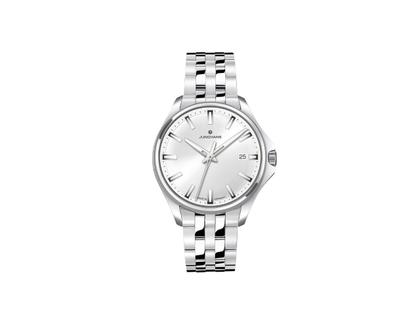 Quarzwerk J645.38, poliertes Edelstahlgehäuse im Durchmesser von 35,0 mm, Höhe 8,8 mm, Edelstahl-Krone, weißes Zifferblatt, Datum auf 3 Uhr, silberfarbene Zeiger und Indizes mit weißer Leuchtmasse, schwarze Minuterie, poliertes mehrgliedriges Edelstahlarmband mit Faltschließe, Saphirglas entspiegelt, 7-fach verschraubter Edelstahl-Gehäuseboden mit Junghans Stern-Grafik, 10 bar wasserdicht