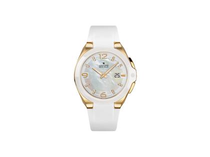 Multifrequenz-Funk-Solarwerk J615.74, Dunkelgangreserve bis zu 21 Monaten, Sleepmode nach 72 Stunden, Edelstahlgehäuse mit gelbgolder PVD-Beschichtung und weißer Keramik, Durchmesser von 35,6 mm, Höhe 8,9 mm, Solarzifferblatt mit Perlmutt mit kleiner digitaler Anzeige, 16 Diamanten, Zeiger mit umweltfreundlicher Leuchtmasse, Synthetisches weißes Kautschukarmband mit goldener Dornschließe, Saphirglas, Mineralglasboden bedampft, 10 bar wasserdicht