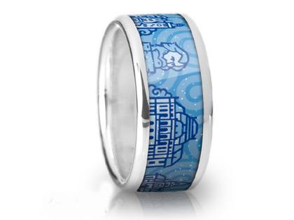 Ring aus 925/- Silber mit transparenter High-Tech Keramik, mit farbigem Chemnitz-Motiv: Altes und Neues Rathaus, Karl-Marx-Monument, Opernhaus, Petrikirche, Roter Turm, Wasserschloss Klaffenbach