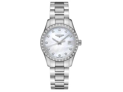 Longines Conquest Classic Damenuhr Quarz Stahl weiß Perlmutt Edelstahlband Diamanten