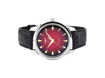 Schweizer Automatikwerk Kaliber L888 mit einer Unruhfeder aus monokristallinem Silizium und einer Gangreserve von 72 Stunden, Edelstahlgehäuse poliert, Durchmesser 40,0 mm, Höhe 10,8 mm, rotes Sonnenschliff-Zifferblatt mit Farbverlauf, polierte vergoldete Zeiger mit Swiss Super-LumiNova Leuchtmasse, aufgesetzte gelbgoldfarbene Indizes, schwarzes Alligatorlederarmband mit Edelstahl-Dornschließe, Saphirglas entspiegelt, verschraubter Edelstahl-Gehäuseboden mit einer Sondergravur, 5 bar wasserdicht - limitiert auf 2.025 Exemplare weltweit
