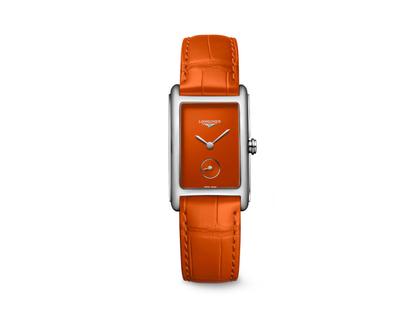 Longines DolceVita Medium Quarz Edelstahl 23x37mm oranges Zifferblatt oranges Lederband