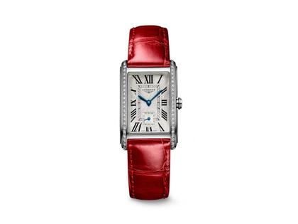 Longines DolceVita Medium Quarz Edelstahl 23x37mm silbernes Zifferblatt römisch mit Brillanten rotes Lederband