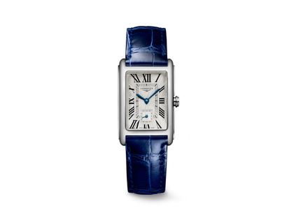 Longines DolceVita Medium Quarz Edelstahl 23x37mm silbernes Zifferblatt römisch blaues Lederband