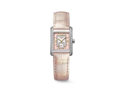Quarzwerk Kaliber 178, rechteckiges Edelstahlgehäuse umrahmt von 38 Diamanten zusammen 0,456ct TW(G) if-vvs, Maße 22 x 29 mm, Höhe 6,75mm, rechteckiges Zifferblatt mit Guilloche-Effekt auf blütenrosanem Untergrund, Stundenanzeige, kleine Sekunde auf 6 Uhr, vergoldete römische Ziffern und Zeiger, blütenrosanes Alligatorlederband mit Edelstahl-Dornschließe, Saphirglas beidseitig entspiegelt, 3 bar wasserdicht