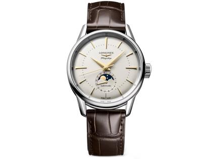 Longines Flagship Heritage Automatik Edelstahl 38,5mm silber-goldenes Zifferblatt Mondphase braunes Lederband