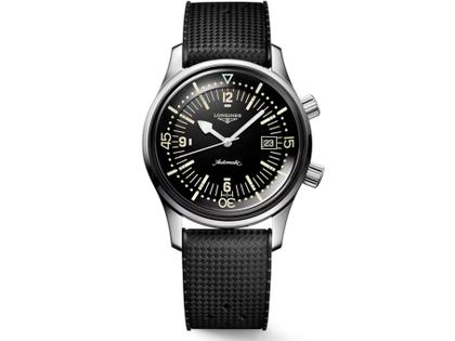 Heritage Legend Diver Watch, runde Herrenuhr, Automatik Kaliber L888 mit einer Gangreserve von 72 Stunden, Edelstahlgehäuse mit einem Durchmesser von 42 mm, Höhe 14 mm, schwarzes Zifferblatt mit Datumsanzeige auf 3 Uhr, strukturiertes Kautschukband mit Faltschließe, Saphirglas, Glasboden, 30 bar wasserdicht