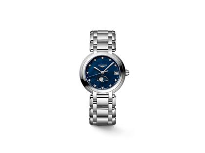 Longines PrimaLuna Mondphase Quarz Edelstahl 30mm blaues Zifferblatt mit Brillanten Metallband