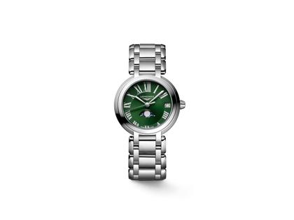 Longines PrimaLuna Mondphase Quarz Edelstahl 30mm grünes Zifferblatt Metallband