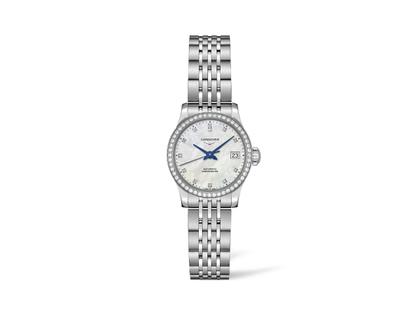 Longines Record Chronometer Automatik 26 mm Diamantlünette Edelstahl Perlmutt Diamanten Metallband