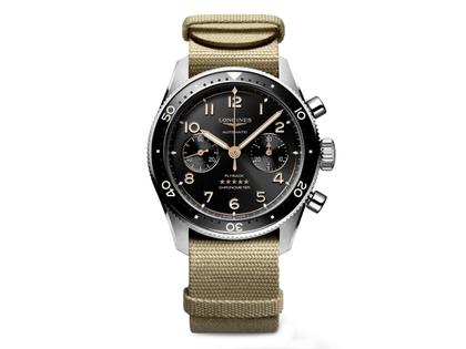 Longines Spirit Flyback Chronograph Automatik Edelstahl 42mm schwarzes Zifferblatt beiges Textilband