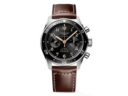 Longines Spirit Flyback Chronograph Automatik Edelstahl 42mm schwarzes Zifferblatt braunes Lederband