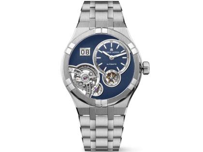 Maurice Lacroix Aikon Master Grand Date Automatik Edelstahl 45mm blaues Zifferblatt Metallband und blaues Textilband