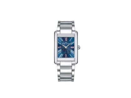Schweizer Quarzwerk, poliertes Edelstahlgehäuse mit den Abmessungen von 24,0 x 34,0 mm, Höhe 6,5 mm, blaues Sonnenschliff-Zifferblatt, silberfarbener Stunden- und Minutenzeiger, weiße römische Ziffern, poliertes Edelstahlband mit Faltschließe und Armband-Schnellwechselsystem, Saphirglas entspiegelt, Edelstahl-Gehäuseboden, 5 bar wasserdicht