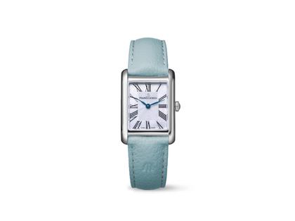 Schweizer Quarzwerk, poliertes Edelstahlgehäuse beschichtet mit den Abmessungen von 24,0 x 34,0 mm, Höhe 6,5 mm, weißes Perlmutt-Zifferblatt, gebläuter Stunden- und Minutenzeiger, schwarze römische Ziffern, blaues Lederarmband mit Dornschließe und Armband-Schnellwechselsystem, Saphirglas entspiegelt, Edelstahl-Gehäuseboden, 5 bar wasserdicht