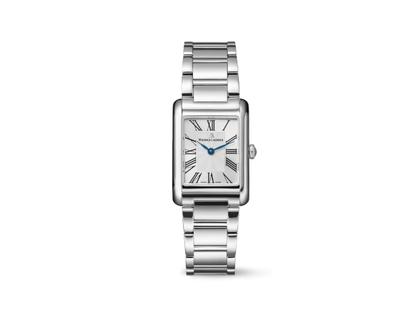 Schweizer Quarzwerk, poliertes Edelstahlgehäuse beschichtet mit den Abmessungen von 24,0 x 34,0 mm, Höhe 6,5 mm, silberfarbenes Zifferblatt, gebläuter Stunden- und Minutenzeiger, schwarze römische Ziffern, poliertes Edelstahlarmband mit Faltschließe und Armband-Schnellwechselsystem, Saphirglas entspiegelt, Edelstahl-Gehäuseboden, 5 bar wasserdicht
