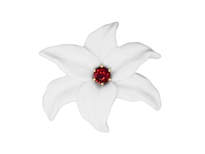 Brosche in Form einer Blüte aus Meissener Porzellan, mit einem facettierten roten Granat in einer Krappenfassung, Verschluss / Nadel aus 925/- Silber rosévergoldet, Höhe 4,8 cm, Breite 5,5 cm, Tiefe 1,5 cm