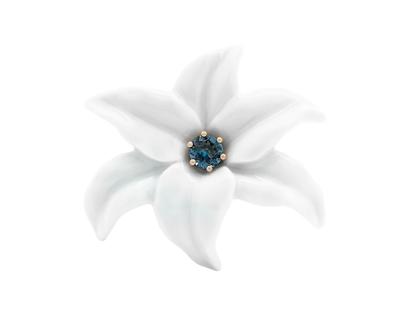 Brosche in Form einer Blüte aus Meissener Porzellan, mit einem facettierten blauen Topas in einer Krappenfassung, Verschluss / Nadel aus 925/- Silber rosévergoldet, Höhe 4,8 cm, Breite 5,5 cm, Tiefe 1,5 cm