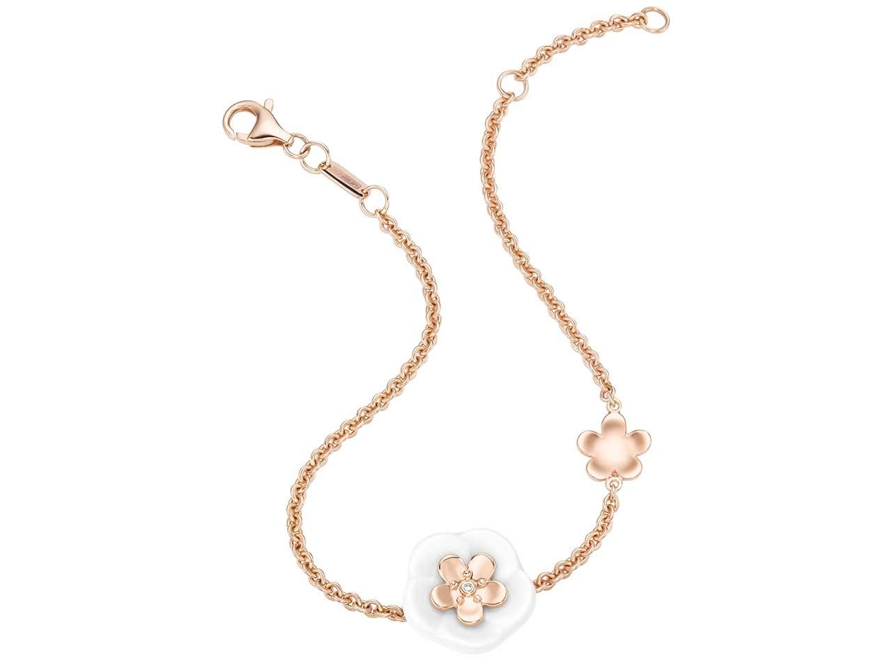 Armband 750/- Roségold und Meissener Porzellan® mit Blütenstempel, 1 Brillant 0,01 ct TW vsi, Blüte 750/- Roségold, Ankerkette mit Karabinerverschluss, 19 cm lang, Porzellanblüte M 13mm, Roségoldblüte XS 7mm.