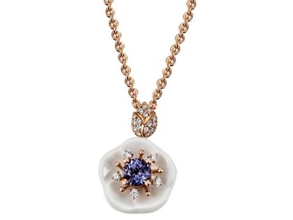 Collier "Tansanit Blau" aus 750/- Rosegold poliert mit 21 Brillanten TW vsi 0,14 ct in Blütenmitte, 1 Tansanit Blau 0,55 ct facettiert, Blüte aus Meissener Porzellan®, ca. 45 cm lang