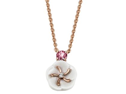 Collier "Turmalin Rosa" aus 750/- Rosegold poliert mit 1 Brillanten TW vsi 0,04 ct in Blütenmitte, 1 Turmalin Rosa 0,51 ct facettiert, Blüte aus Meissener Porzellan®, länge ca. 45 cm