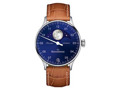 MeisterSinger Lunascope Automatik Edelstahl blaues Zifferblatt, braunes Lederband
