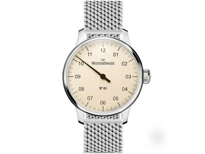 Einzeigeruhr, Handaufzug, Kaliber SW210, Edelstahl, Durchmesser 43mm, Höhe 11,5mm, elfenbeinfarbenes Zifferblatt, schwarzer Zeiger, massives Edelstahlband (Milanaise) mit Faltschließe, Saphirglas und Edelstahlboden, 5 bar wasserdicht