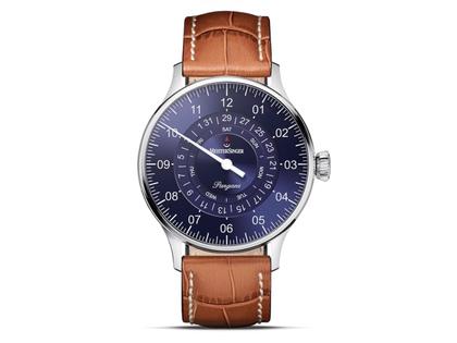 MeisterSinger Einzeigeruhr, Automatik Sellita SW220-1, Gehäuse aus Edelstahl, Durchmesser 40 mm, Höhe 10,1 mm, blaues Zifferblatt, Sonnenschliff, weißer Zeiger, braunes geprägtes Lederband, Saphirglas, 6fach verschraubter Glasboden, 5 bar wasserdicht, Datums- und Wochentagsanzeige.