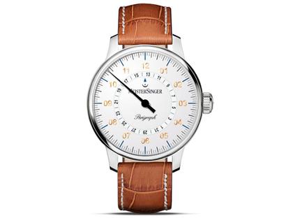 MeisterSinger Einzeigeruhr mit Datumsanzeige, Automatik Kaliber Sellita SW200, Gehäuse aus Edelstahl, Durchmesser 43 mm, Höhe 11,3 mm, Gewicht 78 g, weißes Zifferblatt, goldfarbene Ziffern, gebläuter Zeiger, braunes Lederband, Saphirglas, 6fach verschraubter Glasboden, 5 bar wasserdicht
