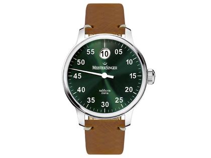 MeisterSinger Salthora Jumping Hour Meta, typische Einzeigeruhr von MeisterSinger - nur diesmal wird die Stunde mittels einer Scheibe im runden Fenster bei 12 Uhr dargestellt - die Minuten mit dem markanten weißen Zentralzeiger, Automatik ETA 2824-2 bzw. Sellita SW 200 mit eigenem MeisterSinger Modul für die Springende Stunde, Gehäuse Edelstahl, Durchmesser 43mm, dunkelgrünes Zifferblatt, Sonnenschliff, weiße Ziffern, cognac farbenes Vintage Lederband, Faltschließe, Saphirglas, Glasboden, 5 bar wasserdicht