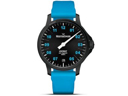 MeisterSinger Unomat Automatik Edelstahl 43mm schwarzes Zifferblatt blaues Kautschukband limitiert