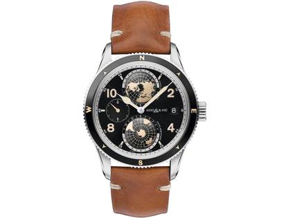 runde Herrenuhr, Automatik Kaliber MB 29.25, Gangreserve von 42 Stunden, Edelstahlgehäuse im Durchmesser von 42 mm, Edelstahllünette mit schwarzem Keramikeinsatz, schwarzes Zifferblatt mit Datumsanzeige, zweiter Zeitzone, Weltzeit mit nördlicher und südlicher Hemisphere mit Tag- und Nachtanzeige, braunes Kalbslederband mit Faltschließe, Saphirglas, Edelstahlgehäuseboden mit "Spirit of Mountain Exploration"- Gravur, 10 bar wasserdicht