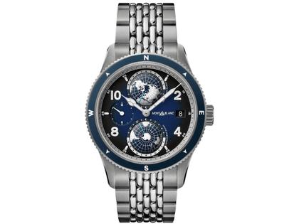 Die Weltzeituhr verfügt über ein 42-mm-Titangehäuse, das mit blauen und kontrastierenden Designdetails in frostigem Weiß kombiniert ist, um auf die Farben der Eisberge zu verweisen. Die Uhr ist mit der Manufaktur-Weltzeitkomplikation ausgestattet, die von den Montblanc-Uhrmachern in Villeret entwickelt wurde: zwei gewölbte Halbkugeln, die sich in entgegengesetzter Richtung bewegen und innerhalb von 24 Stunden eine vollständige Umdrehung vollführen. Beide Halbkugeln sind von Skalen mit den 24 Zeitzonen umgeben und verfügen über eine Tag-/Nachtanzeige in kontrastierenden Farben. Sie sorgen für ein instinktives Ablesen der verschiedenen Zeitzonen, das zudem von der SuperLumiNova-Beschichtung auf den Kontinenten unterstützt wird, um auch in der Dunkelheit diese wichtigen Informationen zu erhalten. Abgerundet wird die Uhr von einem blauen Sfumato-Kalbslederarmband mit weißen Nähten.