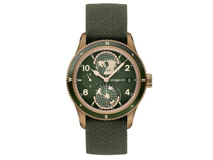 runde Herrenuhr, Automatik Kaliber MB 29.25, Gangreserve von 42 Stunden, Bronzegehäuse im Durchmesser von 42 mm, Bronzelünette mit olivgrünem Keramikeinsatz, grünes Zifferblatt mit Datumsanzeige, zweiter Zeitzone, Weltzeit mit nördlicher und südlicher Hemisphere mit Tag- und Nachtanzeige, grünes Textilband - Nato, Dornschließe mit Bronzebeschichtung, Saphirglas, Gehäuseboden aus Titan mit einer Bronzebeschichtung und Gravur, 10 bar wasserdicht