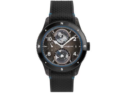 Automatikwerk Kaliber MB 29.25, 42 Stunden Gangreserve, Gehäuse aus CARBO₂, Durchmesser 43,5 mm, Höhe 13,0 mm, beidseitig drehbare Lünette, dunkelgraues Sfumato-Zifferblatt (Gletscher-Optik), Datum und Zweite Zeitzone, Leuchtmasse Super-LumiNova, einfach wechselbares Kautschukarmband mit Faltschließe, gewölbtes Saphirglas entspiegelt, Titanboden mit gefärbter Lasergravur (Mont Blanc), 10 bar wasserdicht, zertifiziert nach ISO 6425 und durch den Montblanc Laboratory 500-Stunden-Test - limitiert auf 1969 Exemplare weltweit