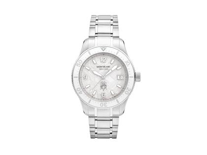 Schweizer Automatikwerk MB24.17 mit einer Gangreserve von 38 Stunden, poliertes Edelstahlgehäuse im Durchmesser von 38,0 mm, Höhe 12,2 mm, einseitig drehbare Lünette mit weißer Keramik-Einlage, weißes Sfumato-Zifferblatt in Gletscher-Optik, Datumsanzeige auf 3 Uhr, silberfarbener Stunden- und Minutenzeiger mit weißer Super-LumiNova Leuchtmasse, silberfarbener Sekundenzeiger, silberfarbene arabische Ziffern und Indizes mit weißer Super-LumiNova Leuchtmasse, poliertes mehrgliedriges Edelstahlarmband mit Faltschließe, Armband-Schnellwechselsystem, Saphirglas entspiegelt, Edelstahl-Gehäuseboden mit Gravur (Eisberg und Taucher), 30 bar wasserdicht zertifiziert nach ISO 6425 und durch den Montblanc Laboratory 500-Stunden-Test