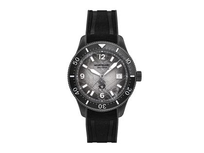 Schweizer Automatikwerk MB24.17 mit einer Gangreserve von 38 Stunden, Gehäuse aus sauerstofffreiem, abgenutztem Stahl im Durchmesser von 41,0 mm, Höhe 12,9 mm, einseitig drehbare Lünette mit schwarzer Keramik-Einlage, graues Sfumato-Zifferblatt in Gletscher-Optik, Datumsanzeige auf 3 Uhr, silberfarbener Stunden- und Minutenzeiger mit weißer Super-LumiNova Leuchtmasse, grauer Sekundenzeiger, silberfarbene arabische Ziffern und Indizes mit weißer Super-LumiNova Leuchtmasse, schwarzes Kautschukarmband mit Faltschließe, Armband-Schnellwechselsystem, Saphirglas entspiegelt, Edelstahl-Gehäuseboden mit Gravur (Eisberg und Taucher), 30 bar wasserdicht zertifiziert nach ISO 6425 und durch den Montblanc Laboratory 500-Stunden-Test