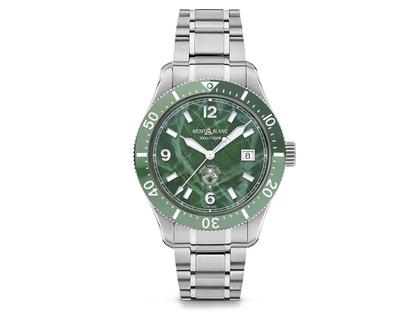 runde Automatik Herrenuhr mit einer Gangreserve von 38 Stunden, Edelstahlgehäuse im Durchmesser von 41 mm, Höhe 12,9 mm, einseitig drehbare Lünette mit zweifarbig grüner Keramik, grünes Zifferblatt mit Gletscher-Optik, einfach wechselbares Edelstahlband mit Faltschließe und Tauchverlängerung, Saphirglas, gravierter Edelstahlboden, 30 bar wasserdicht, Leuchtmasse Super-LumiNova, zertifiziert nach ISO 6425 und durch den Montblanc Laboratory 500-Stunden-Test