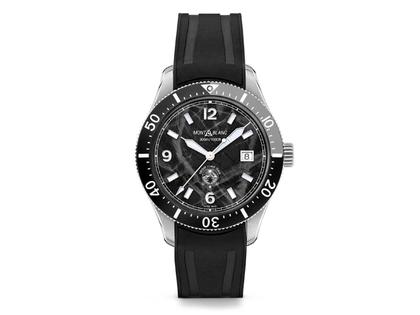 runde Automatik Herrenuhr mit einer Gangreserve von 38 Stunden, Edelstahlgehäuse im Durchmesser von 41 mm, Höhe 12,9 mm, einseitig drehbare Lünette mit schwarzer und grauer Keramik, schwarzes Zifferblatt mit Gletscher-Optik, einfach wechselbares Kautschukband mit Faltschließe, Saphirglas, gravierter Edelstahlboden, 30 bar wasserdicht, Leuchtmasse Super-LumiNova, zertifiziert nach ISO 6425 und durch den Montblanc Laboratory 500-Stunden-Test